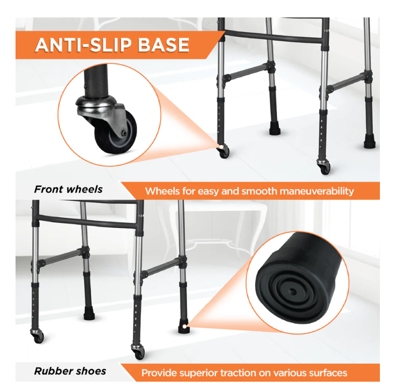 Crafted from sturdy aluminum and equipped with premium-grade rubber tips and PVC grips, it combines durability and ergonomic design to enhance user confidence. The U-shaped frame allows closer body positioning, especially useful when rising from a seated position.